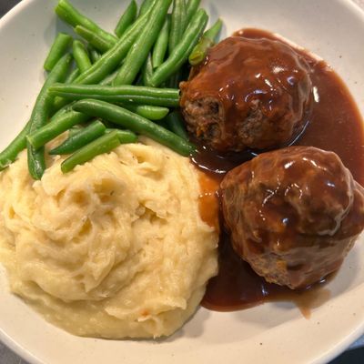 housemade beef rissoles served w. creamy mashed potato, green beans & gravy