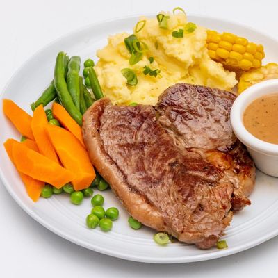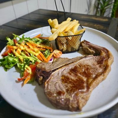 350g t-bone steak cooked to your liking served with chips & salad or mash & veg.