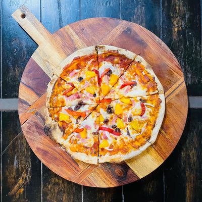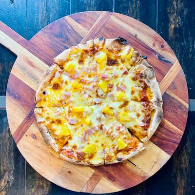 ham, pineapple, bacon, cheese on a tomato base