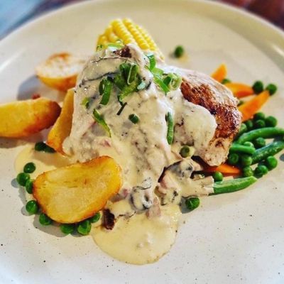 served w. crispy potatoes, vegetables & creamy bacon mushroom sauce