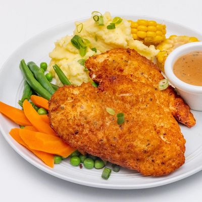panko crumbed chicken schnitzel served w. your choice of two sides
