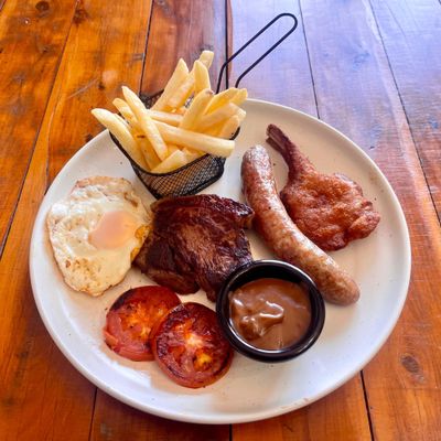 200g rump steak cooked to your liking, pork sausage, lamb cutlet, fried egg, grilled tomato, bacon, mushroom, chips & gravy