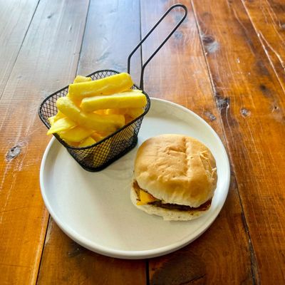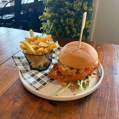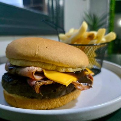 Chicken schnitzel, ham, pineapple, onion rings, lettuce, tomato, cheese, nap sauce and sweet chilli sauce served on a potato bun.