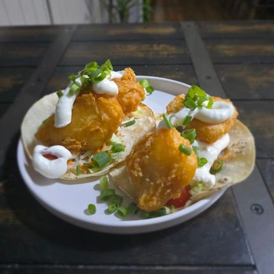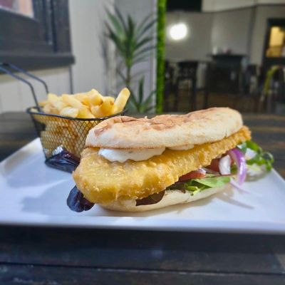 beer battered basa fillet, salad, tomato served on a long turkish roll