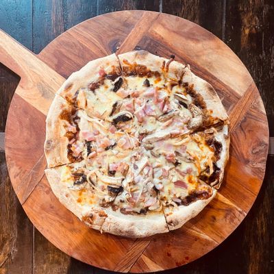 bacon, cabanossi, ground beef, pepperoni, cheese on a bbq base