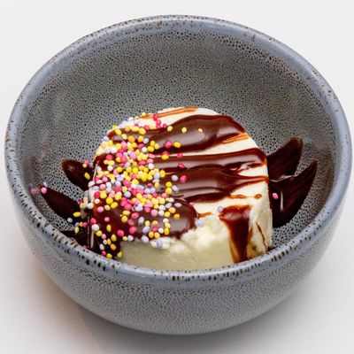Ice cream served with chocolate, strawberry or caramel topping