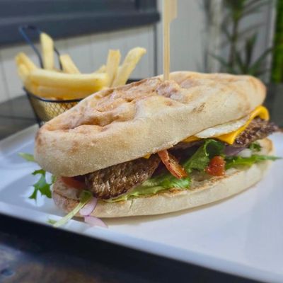 grilled steak, lettuce, beetroot, tomato, bacon, egg, cheese & tomato relish on a long turkish roll
