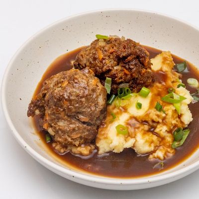 housemade beef rissoles served w. creamy mashed potato, green beans & gravy