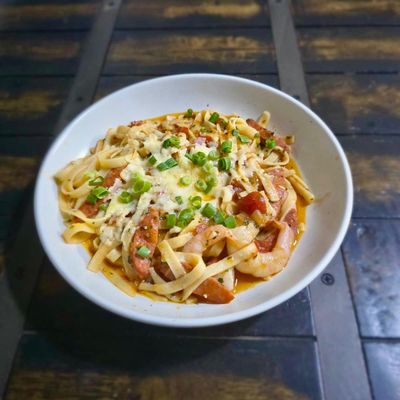 prawns, chorizo, onion, garlic, baby spinach & napoli sauce topped w. parmesan cheese
