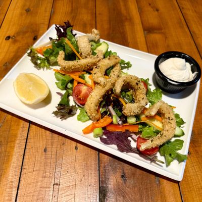 pumpkin & goats cheese arancini balls served w. salad, aioli & feta crumble.