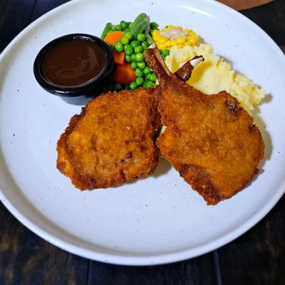 two crumbed lamb cutlets served w. creamy mashed potato, steamed vegetables & gravy